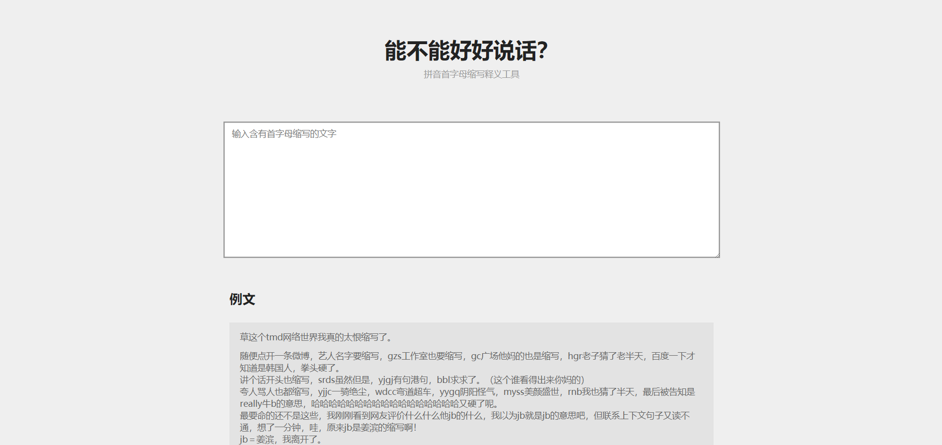 拼音首字母缩写翻译工具:能不能好好说话? A-A+ 逼站 2020年4月19日 0 38 次浏览 有料 | 有趣 cxk | kkp | 抽象话 | 拼音首字母缩写 | 翻译 文章目录传送地址大家好,我叫CXK,我喜欢唱,跳,RAP,篮球,Music…… 传送地址 https://lab.magiconch.com/nbnhhsh 原文链接:拼音首字母缩写翻译工具:能不能好好说话?,转发请注明来源! 上一篇: 有品格的数字古籍图书馆:书格 发表评论 点击这里取消回复。 名称 电子邮件 站点 表情 Submit Comment